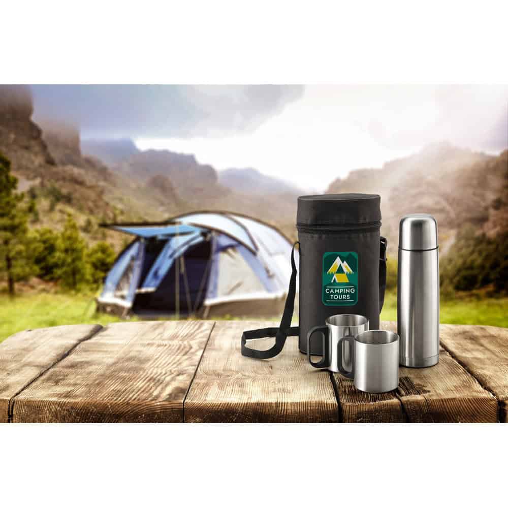 Set med termos flaskor och rostfria muggar. Uppsättningen innehåller 2 muggar med kapacitet upp till 200 mL, dubbel kroppsflaska med kapacitet upp till 500 mL och en 600D påse med justerbar rem