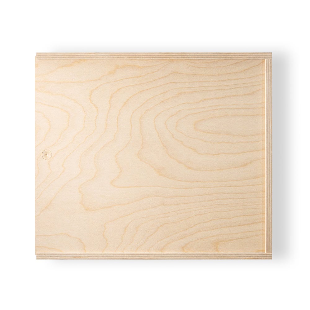 Plywoodlåda med skjutlock, i samma material. Storlek L. Interiör: 330 x 290 x 97 mm | Yttre: 348 x 308 x 111 mm