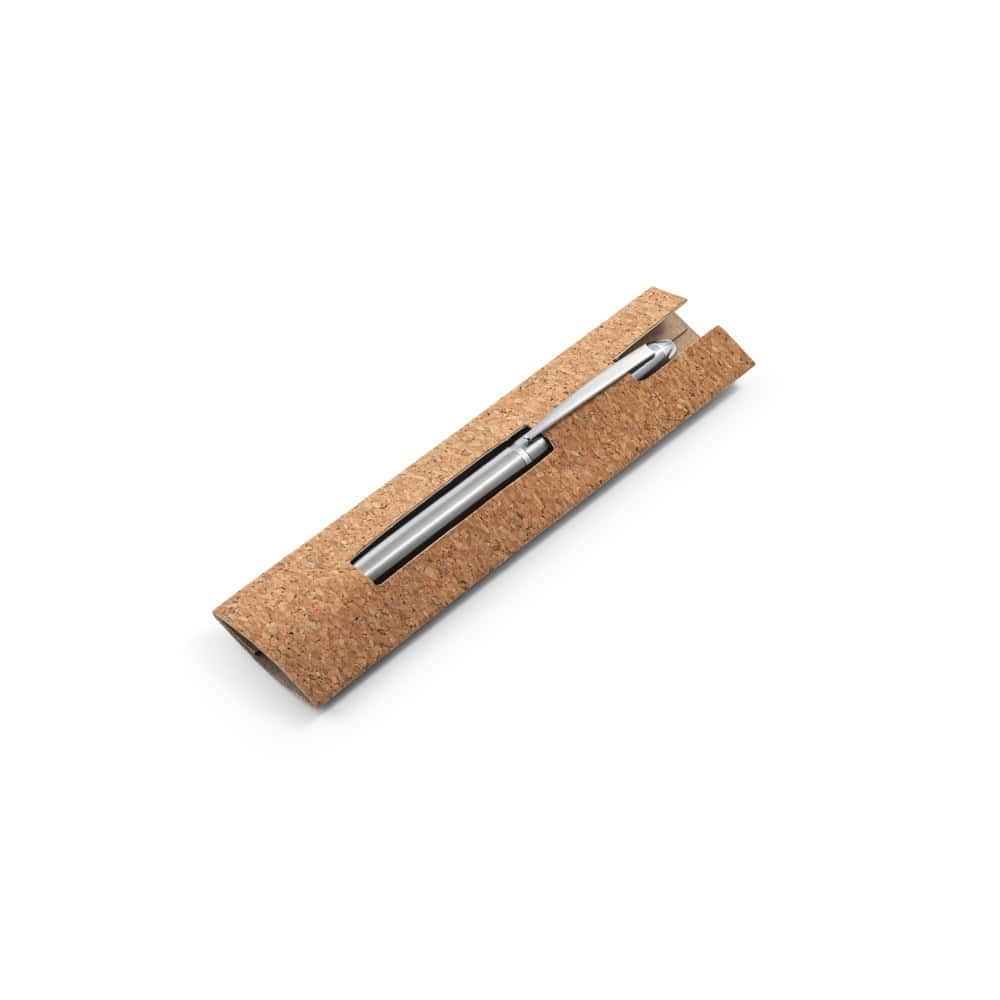 Kulspetspenna med kropp i rostfritt stål (53 % rSS) med klämma. Kulspetspennan har svart bläck och vridmekanism. Levereras i presentpåse av kork. Kulspetspenna: ø11 x 137 mm | Fodral: 155 x 40 mm