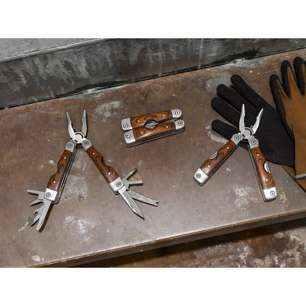 Fälltång med multifunktionsverktyg i rostfritt stål och trä. Innehåller 20 funktioner: tång, skruvmejsel, bits och 10x bitsadapter, lädersyl, flasköppnare, linjal, fiskskalare, krokutdragare, PH-skruvmejsel, skruvmejsel med platt huvud, kniv och skruv. Levereras i en polyesterpåse. 45 x 100 x 25 mm | Påse: 65 x 140 x 30 mm