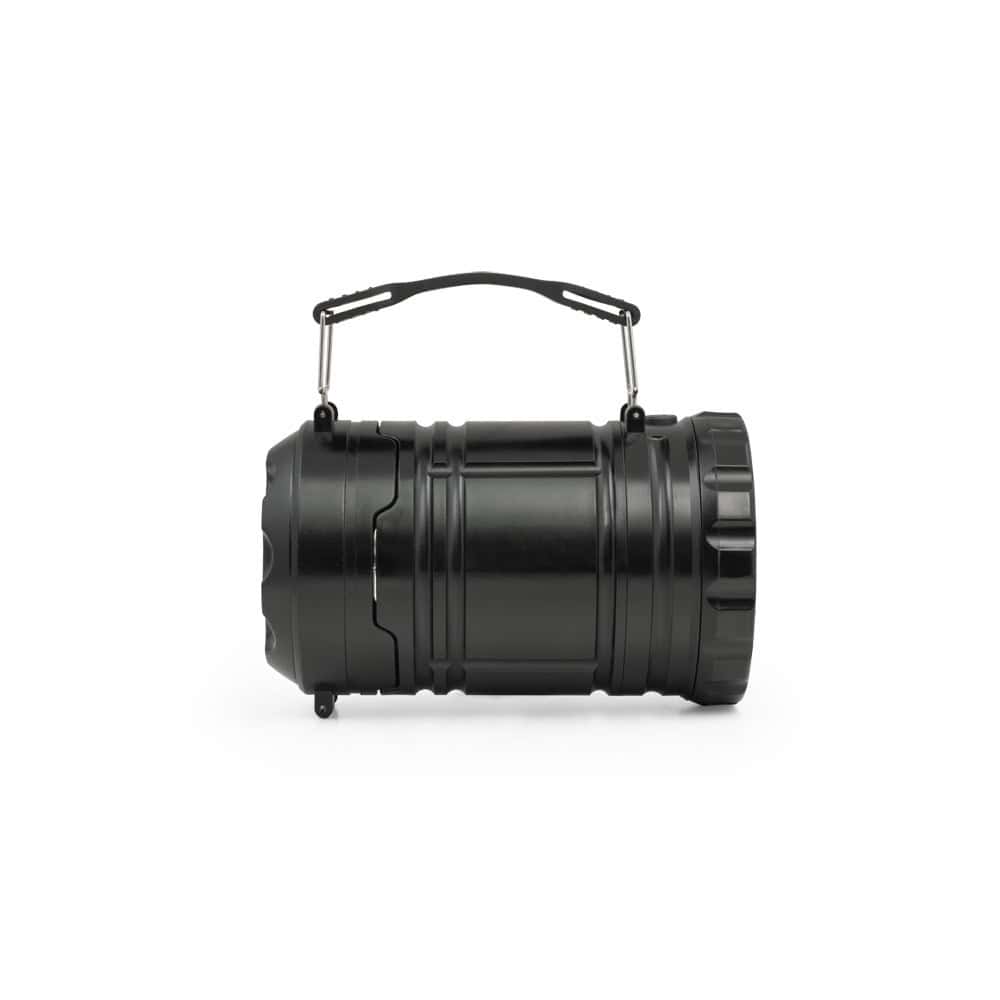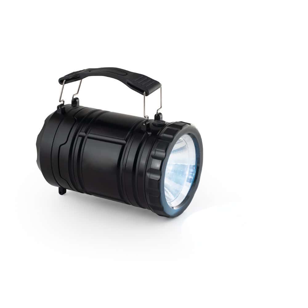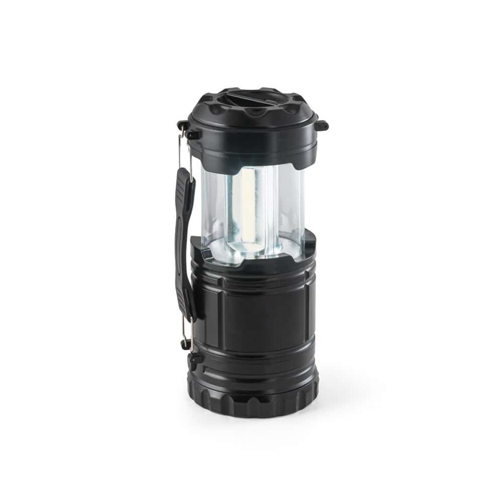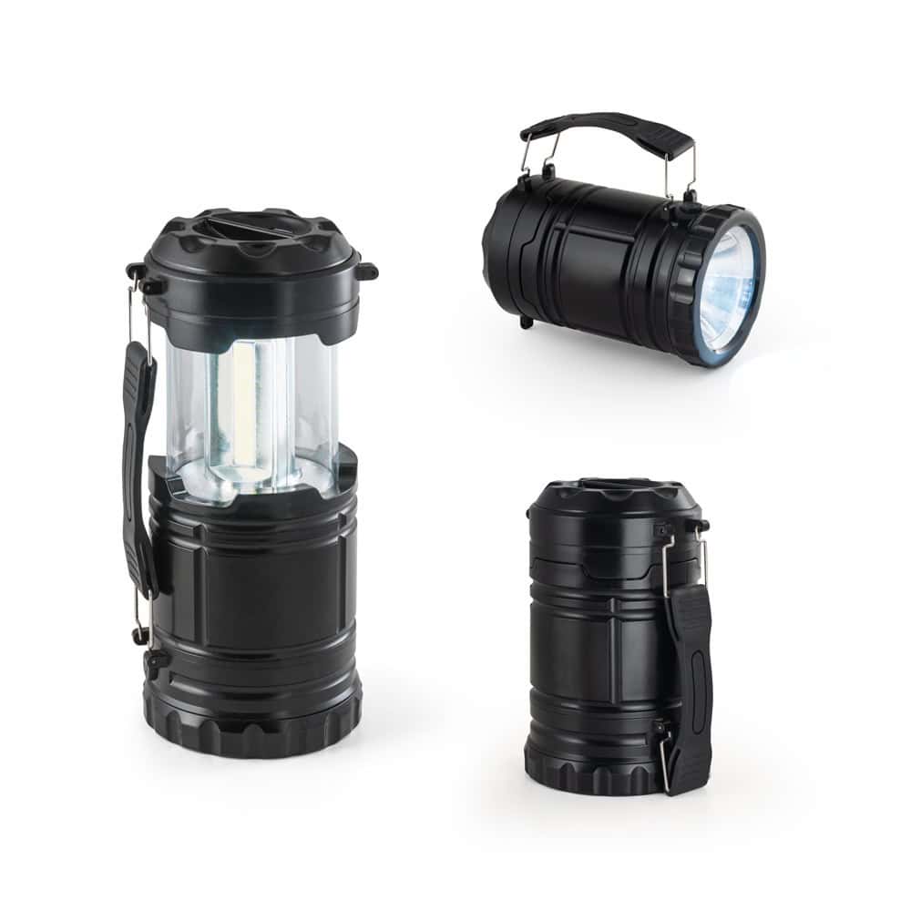 2-i-1 lykta i ABS och PS. 2 användningssätt: utomhus- eller campinglampa, som gör att du kan belysa stora ytor eller som en lykta med hjälp av sidohandtaget som också är avtagbart. Ficklampan har en COB-led (200 lumen) och 1W LED. Idealisk för camping eller utomhusaktiviteter. Inkluderar 3 AA-batterier. Levereras i en låda. 87 x 140 mm