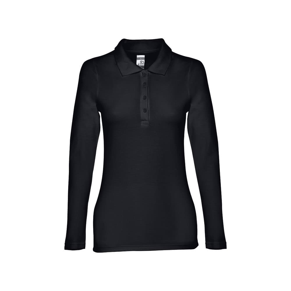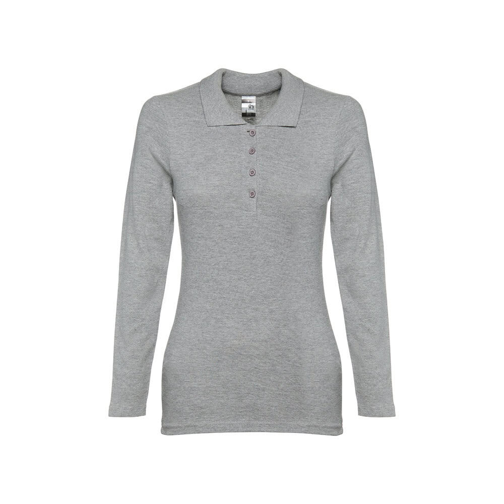 Långärmad polo Dam i pike 100% kardad bomull (210 g/m²) (färg 183: 85% bomull/15% viskos). Ribkrage förstärkt med pikéband. Innehåller förstärkt knapp med 4 matchande färgknappar (extra knapp insatt i innersömmen). Stycke klippt och sytt med dubbla sömmar. Avtagbar synlig etikett. Storlek: S, M, L, XL, XXL