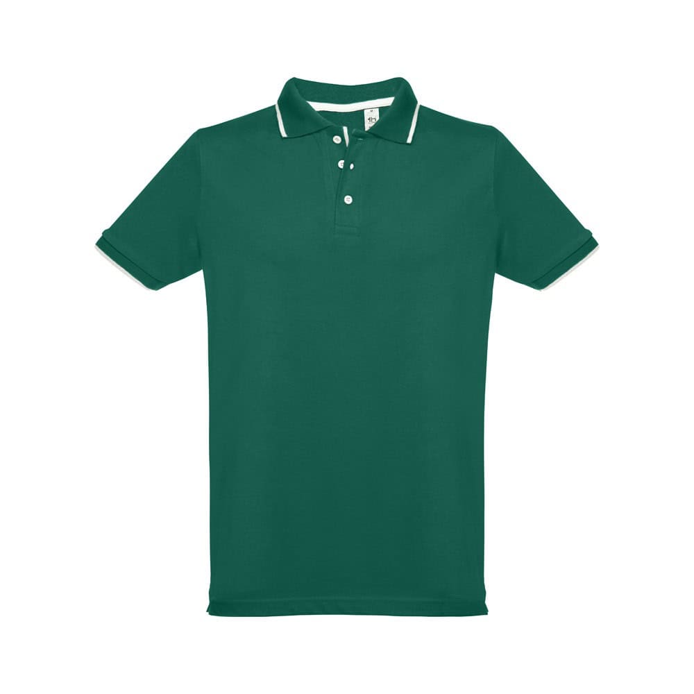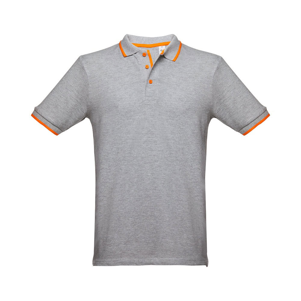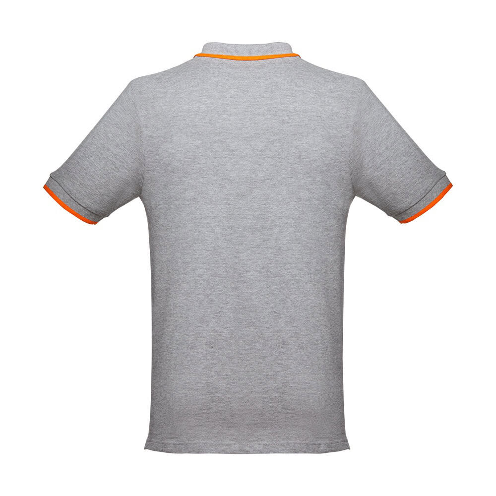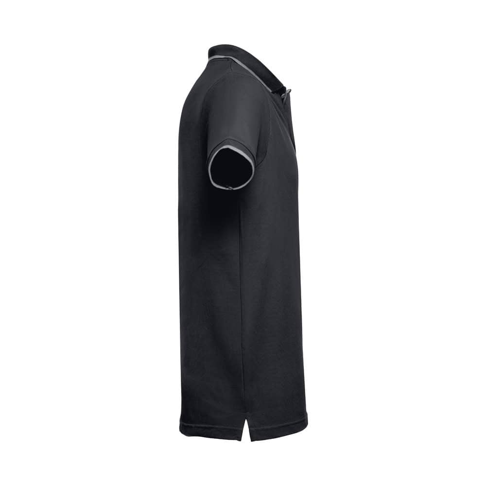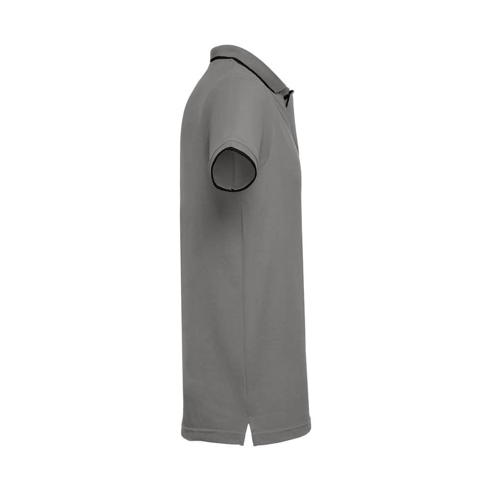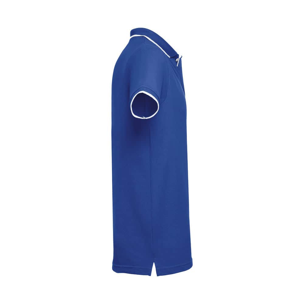 Kortärmad tvåfärgad pike Herr i piké 100% bomullskardad (210 g/m²) (färg: 183: 85% bomull/15% viskos). Tvåfärgad kontrast på krage, ärm och knapp. Innehåller krage och manschetter i Rib. Förstärkt knäppning med 3 kontrasterande färgknappar (extra knapp insatt i den inre sidesömmen). Monterad midja och små sidoslitsar på polons botten. Storlek: S, M, L, XL, XXL