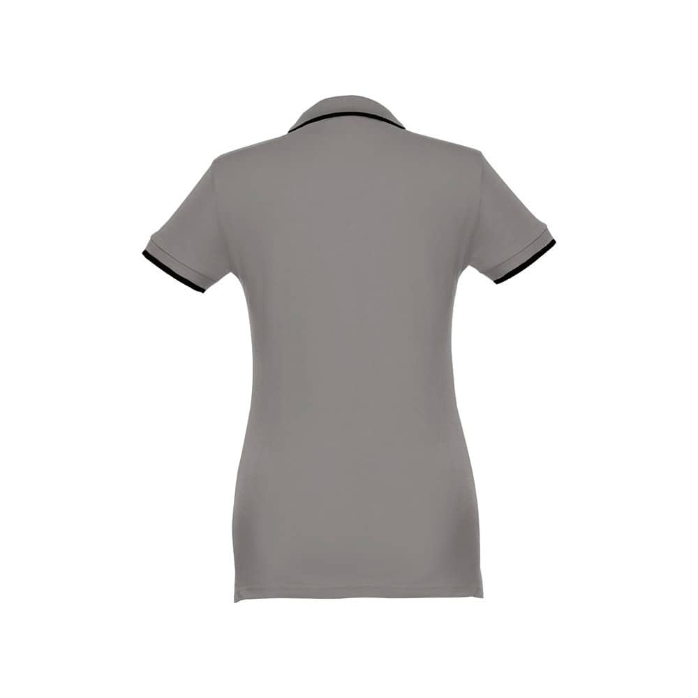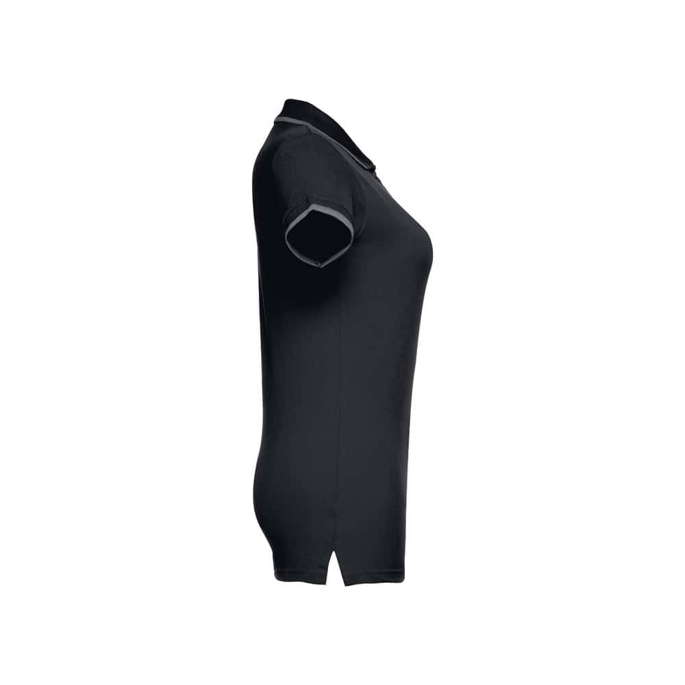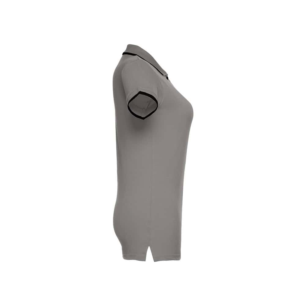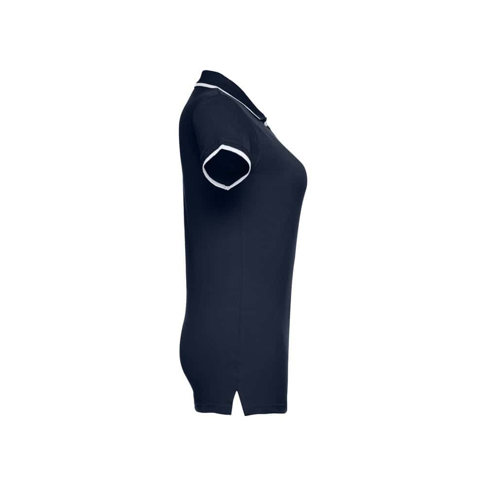 Kortärmad tvåfärgad pike Dam i 100% kardad bomullspiké (210 g/m²) (färg: 183: 85% bomull/15% viskos). Tvåfärgad kontrast på krage, ärm och knapp. Innehåller krage och manschetter i Rib. Förstärkt knäppning med 3 kontrasterande färgknappar (extra knapp insatt i den inre sidesömmen). Monterad midja och små sidoslitsar på polons botten. Storlek: S, M, L, XL, XXL