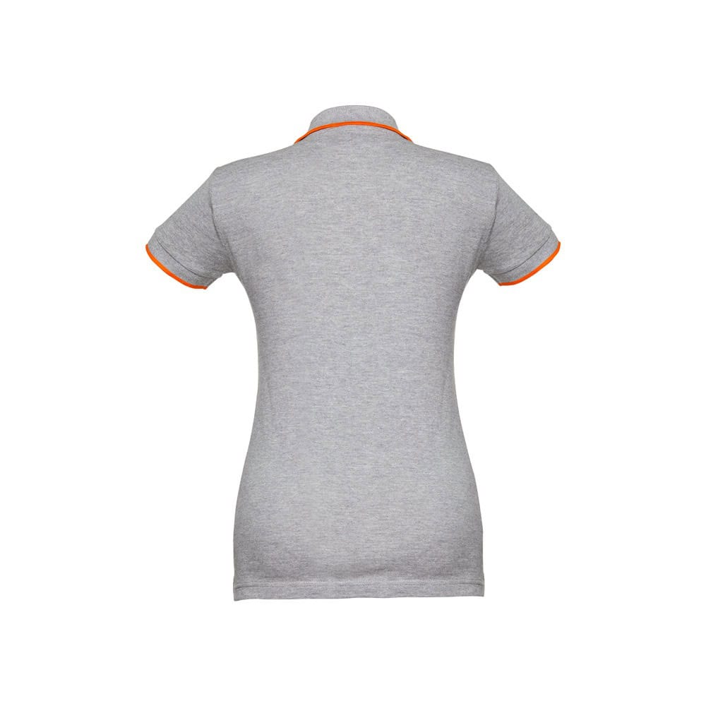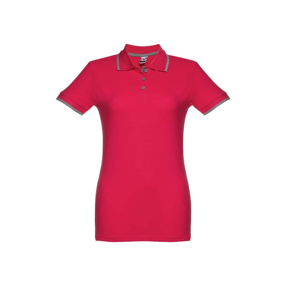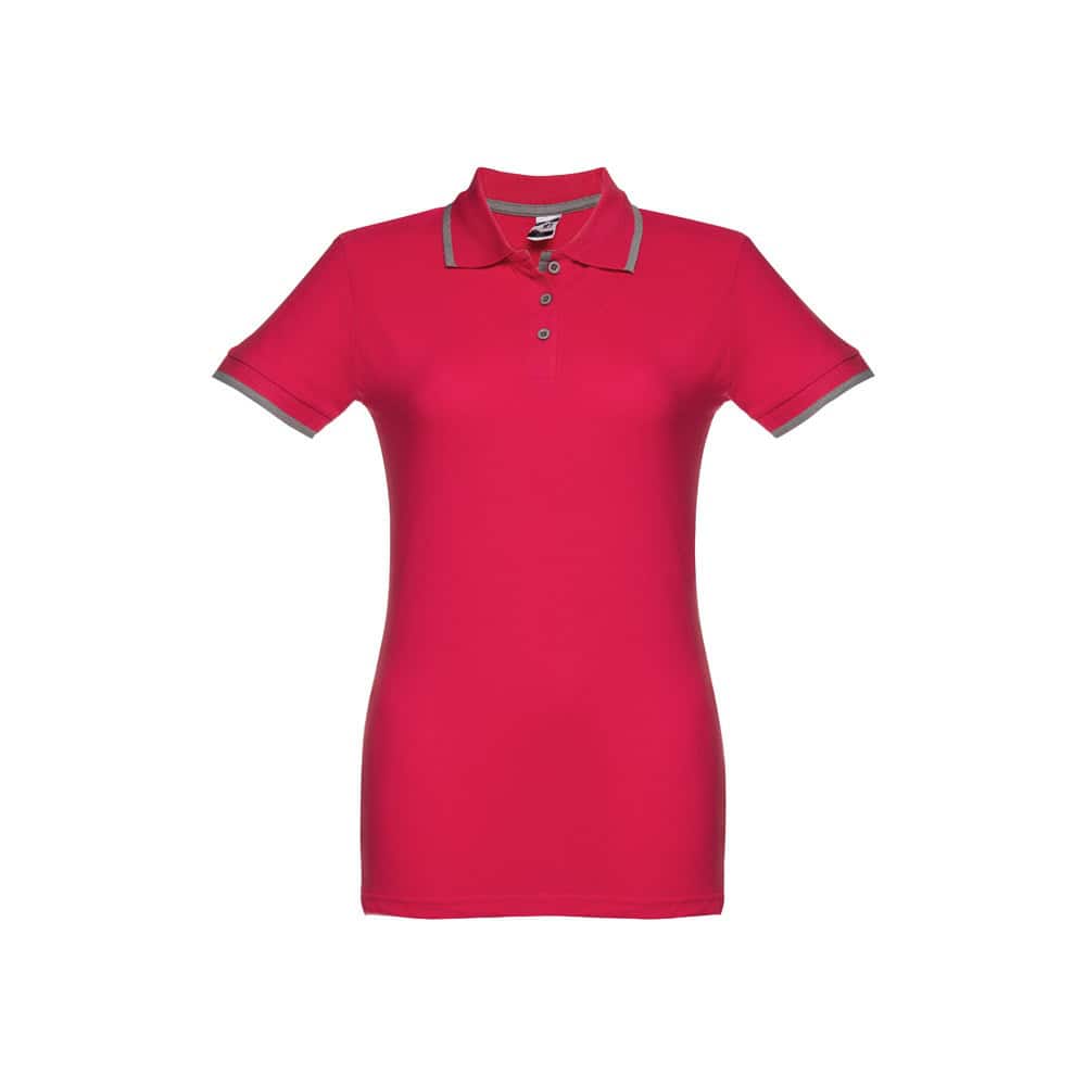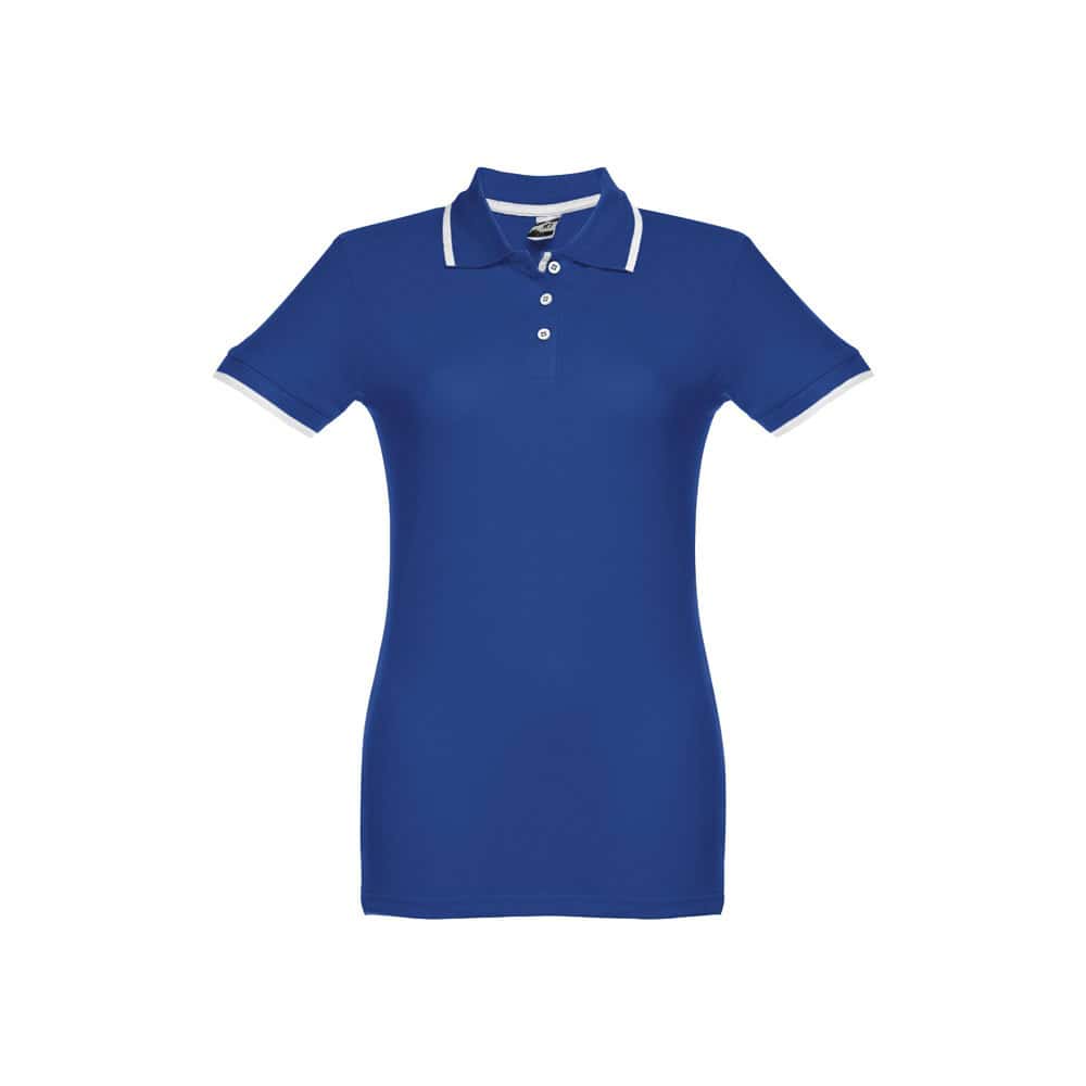 Kortärmad tvåfärgad pike Dam i 100% kardad bomullspiké (210 g/m²) (färg: 183: 85% bomull/15% viskos). Tvåfärgad kontrast på krage, ärm och knapp. Innehåller krage och manschetter i Rib. Förstärkt knäppning med 3 kontrasterande färgknappar (extra knapp insatt i den inre sidesömmen). Monterad midja och små sidoslitsar på polons botten. Storlek: S, M, L, XL, XXL