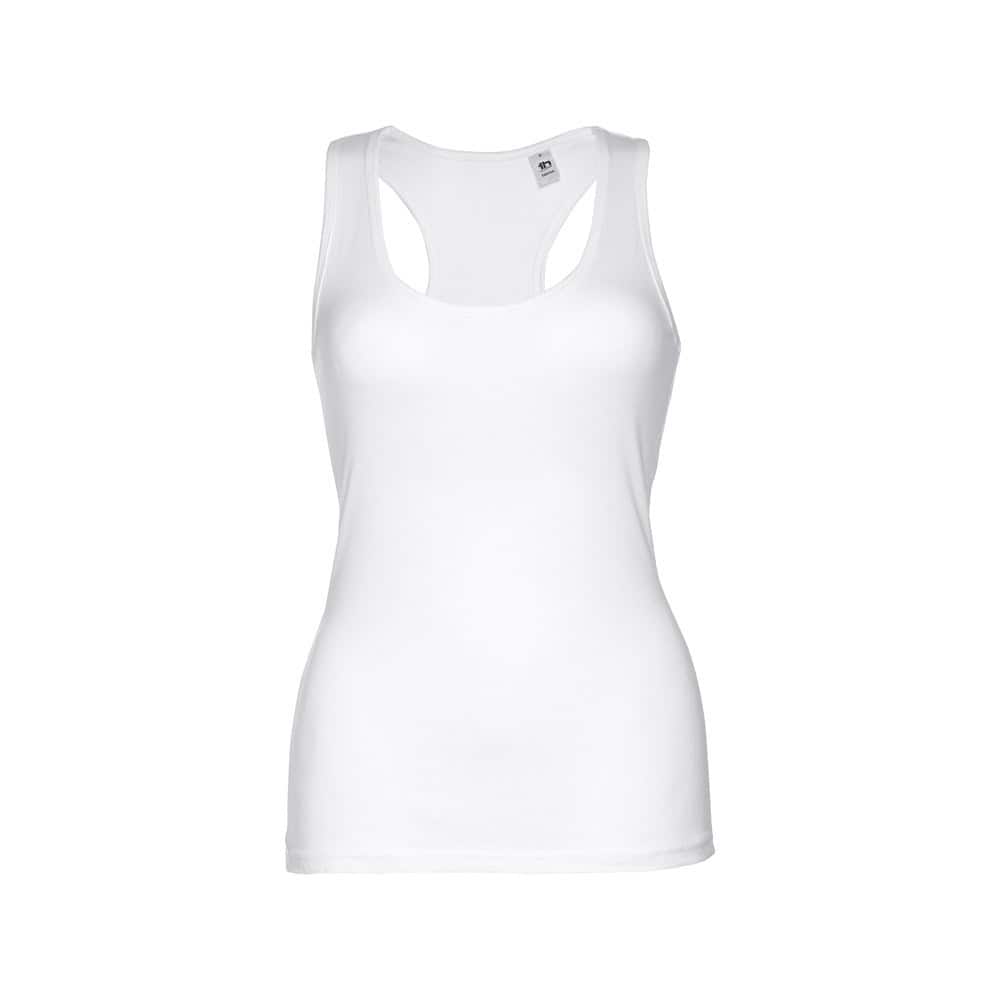 Linne för damer i 100% bomullstriké (160 g/m²) med kardad bomullsgarn. Rund krage och” T” -formad rygg. klippt och sytt plagg med dubbelsömd fåll och förspänning på ärmhål och halsringning. Storlek: S, M, L, XL, XXL