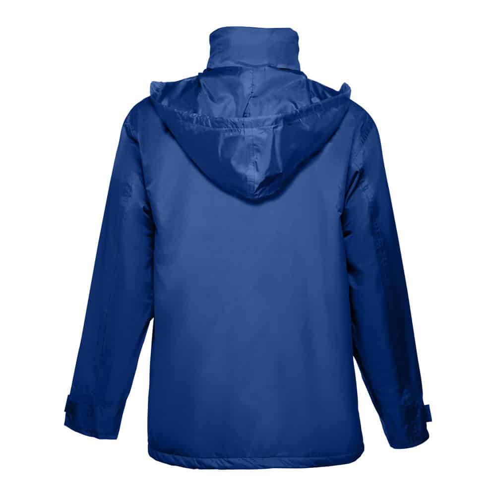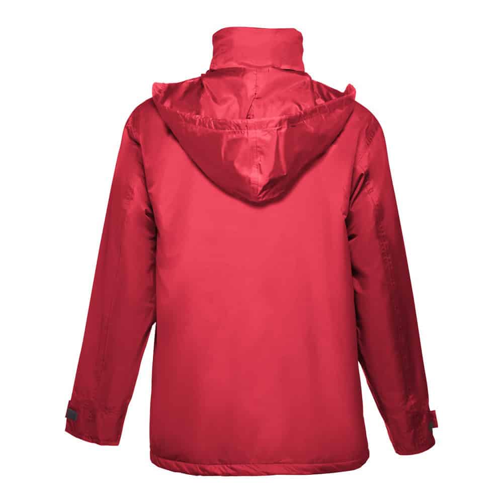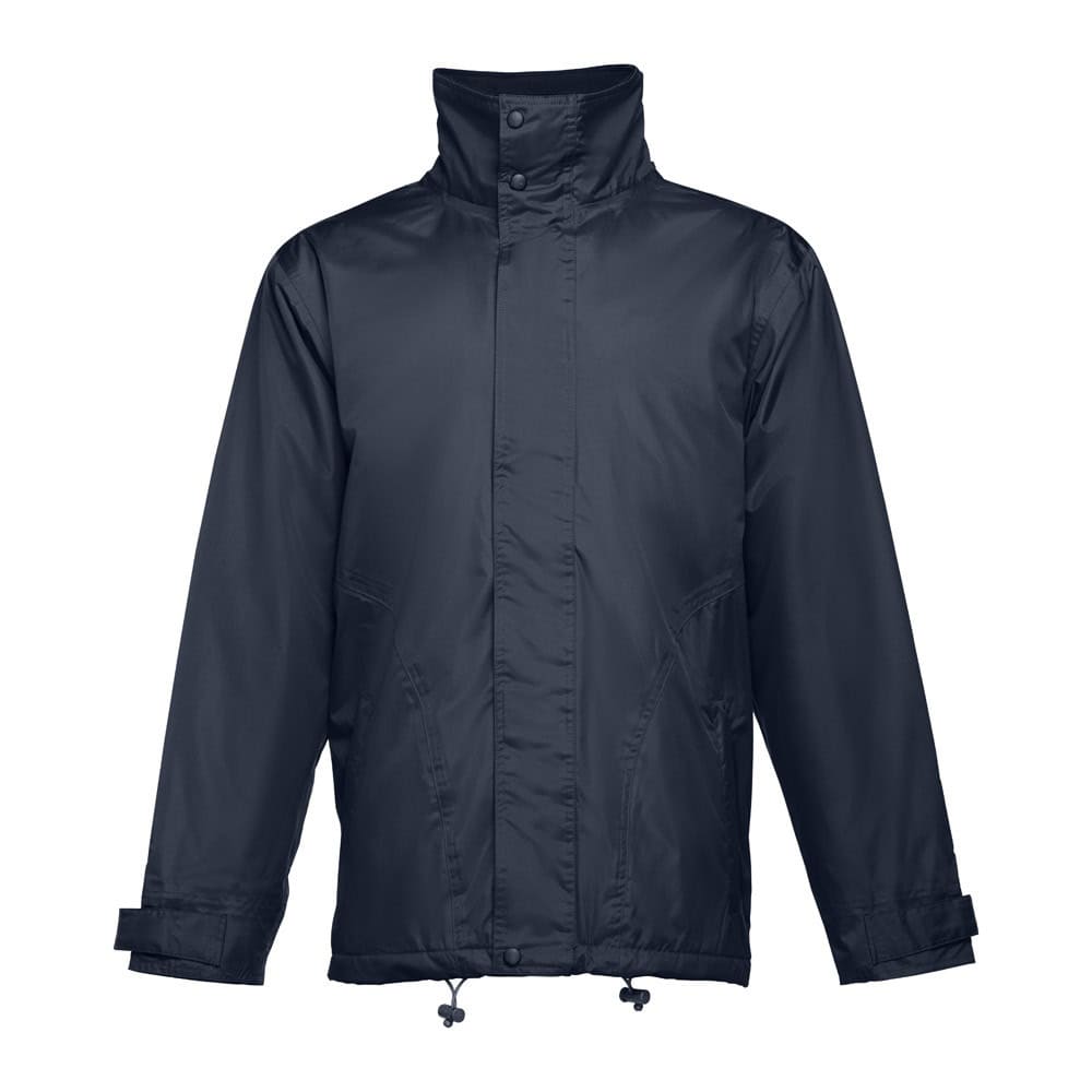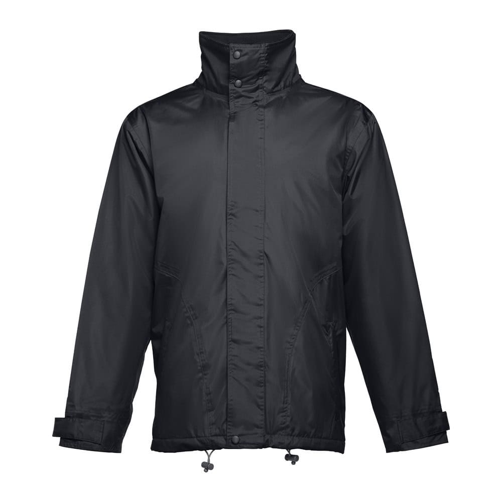 Vadderad parkas (unisex) 100 % polyester (exteriör: 240 g/m² 100 % polyester pongee 240 och vattentät PVC-beläggning, insida: 65 g/m² 100 % polyestertaft, fyllning: 100 % polyester 80 g/m²). Krage fodrad med svart fleece (fast med stängning). Vikbar huva, justerbar med svarta proppar. Öppning med lock, färgad dragkedja, ögla och tryckknappar i svart. Innehåller 2 ytterfickor med klaff och 2 innerfickor (1 för mobiltelefon) med stängning. Inre 2×2 ribbad nätmanschetter och justerbara yttre muddar med stängning. Termoförseglade sömmar. Dragkedja nedre delen av ryggen för tryck. Storlek: XS, S, M, L, XL, XXL