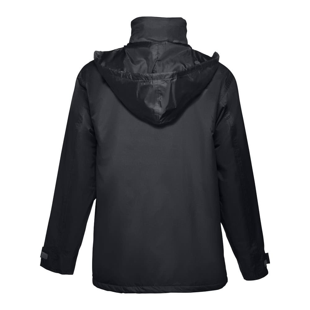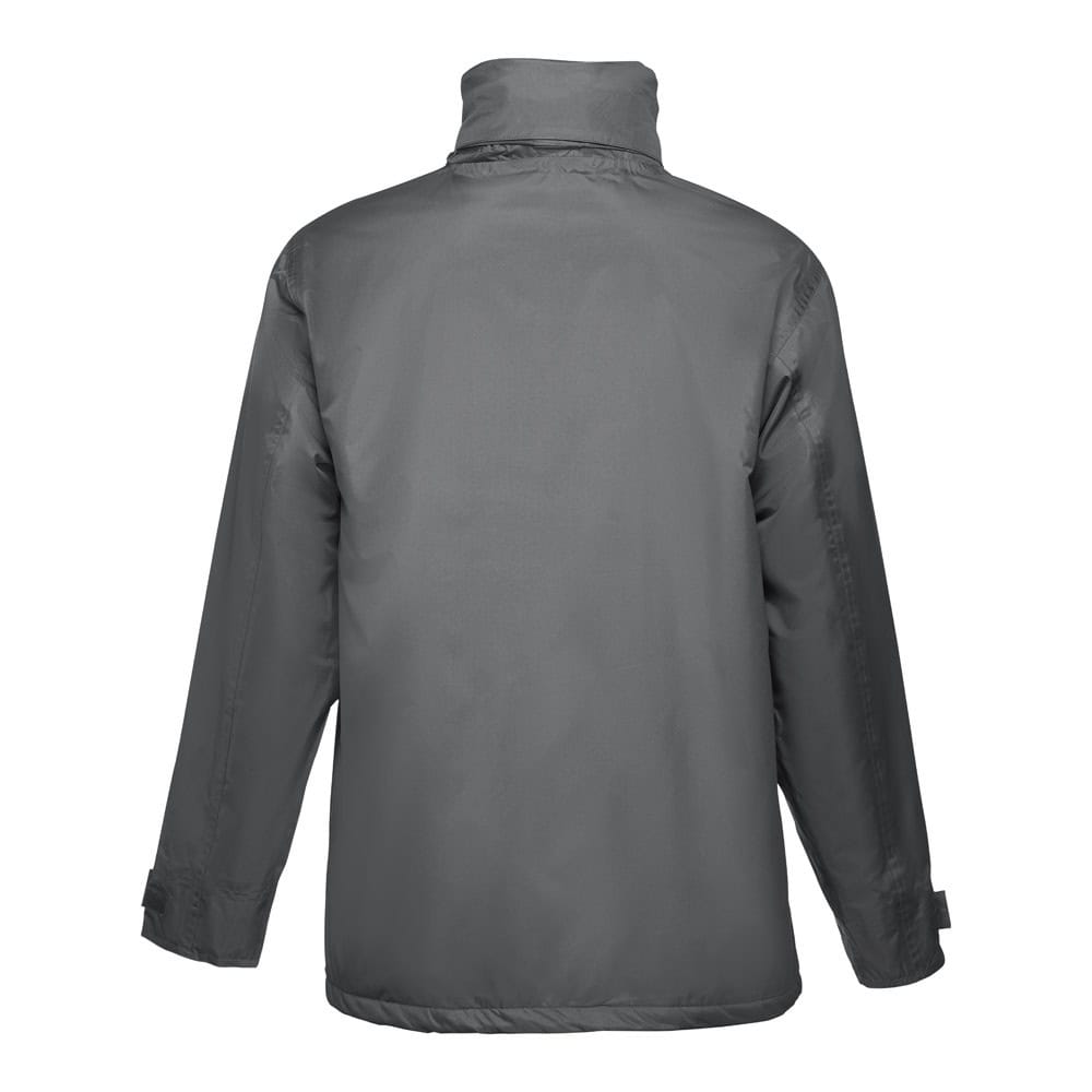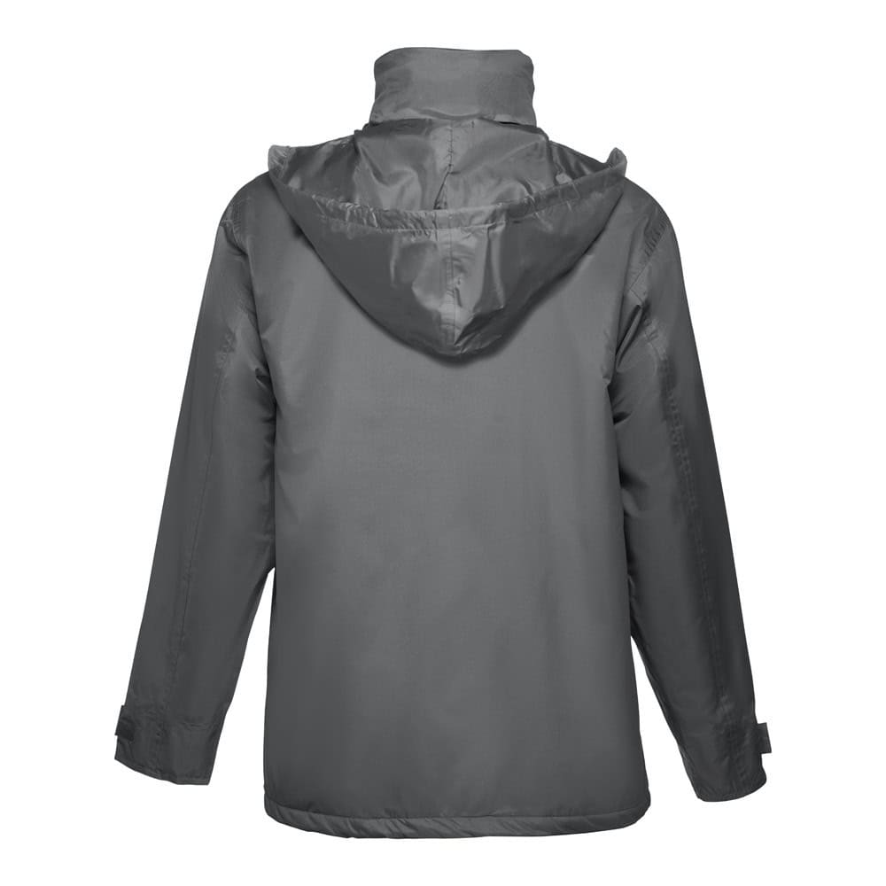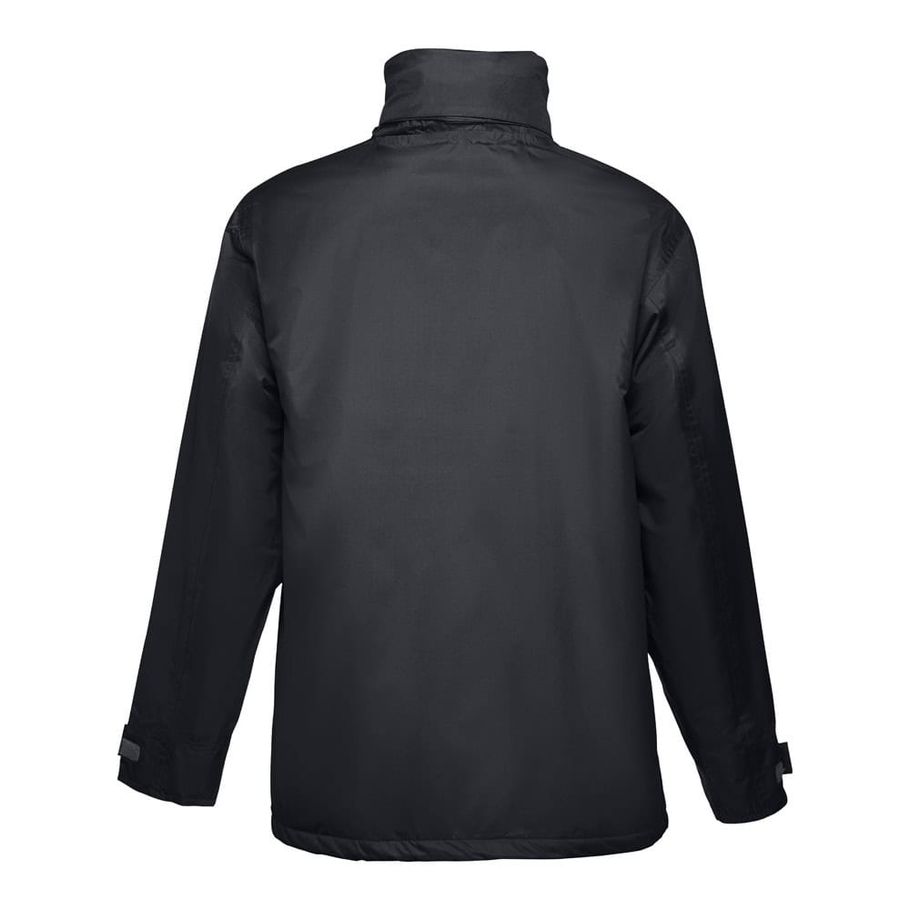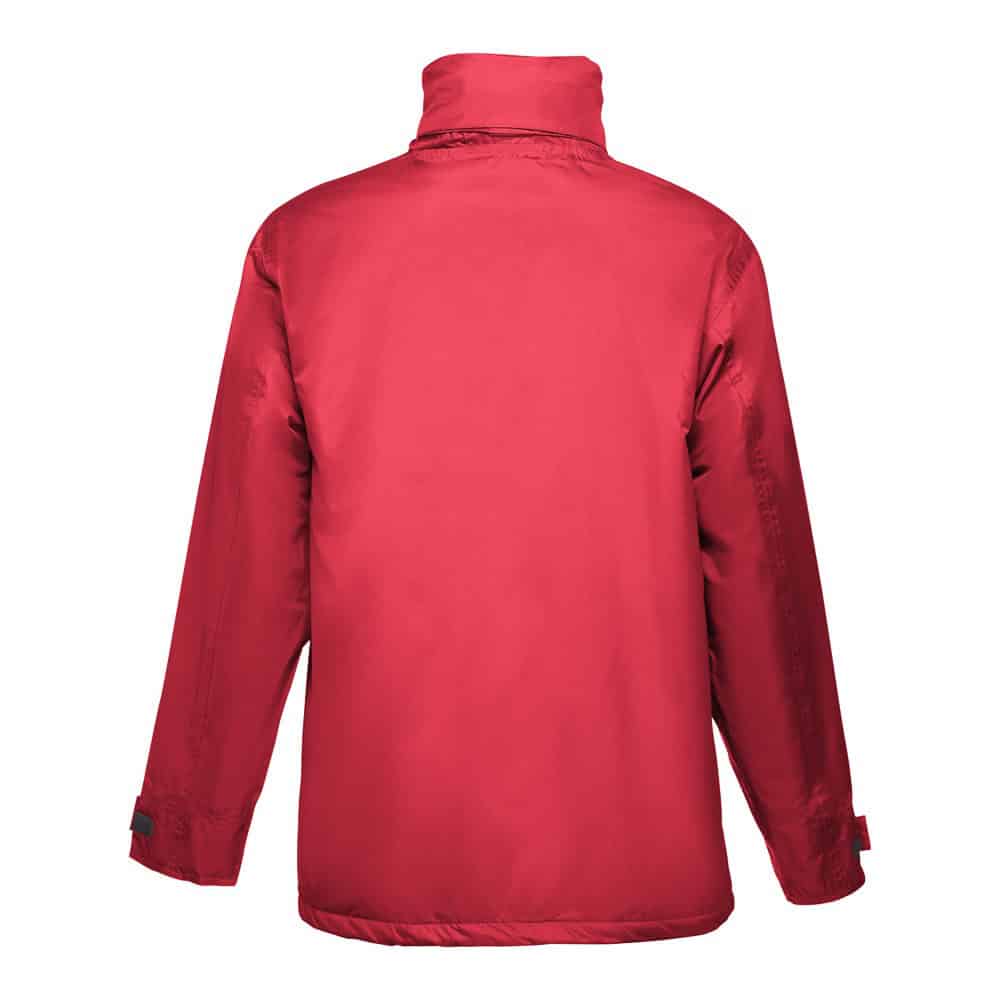 Vadderad parkas (unisex) 100 % polyester (exteriör: 240 g/m² 100 % polyester pongee 240 och vattentät PVC-beläggning, insida: 65 g/m² 100 % polyestertaft, fyllning: 100 % polyester 80 g/m²). Krage fodrad med svart fleece (fast med stängning). Vikbar huva, justerbar med svarta proppar. Öppning med lock, färgad dragkedja, ögla och tryckknappar i svart. Innehåller 2 ytterfickor med klaff och 2 innerfickor (1 för mobiltelefon) med stängning. Inre 2×2 ribbad nätmanschetter och justerbara yttre muddar med stängning. Termoförseglade sömmar. Dragkedja nedre delen av ryggen för tryck. Storlek: XS, S, M, L, XL, XXL